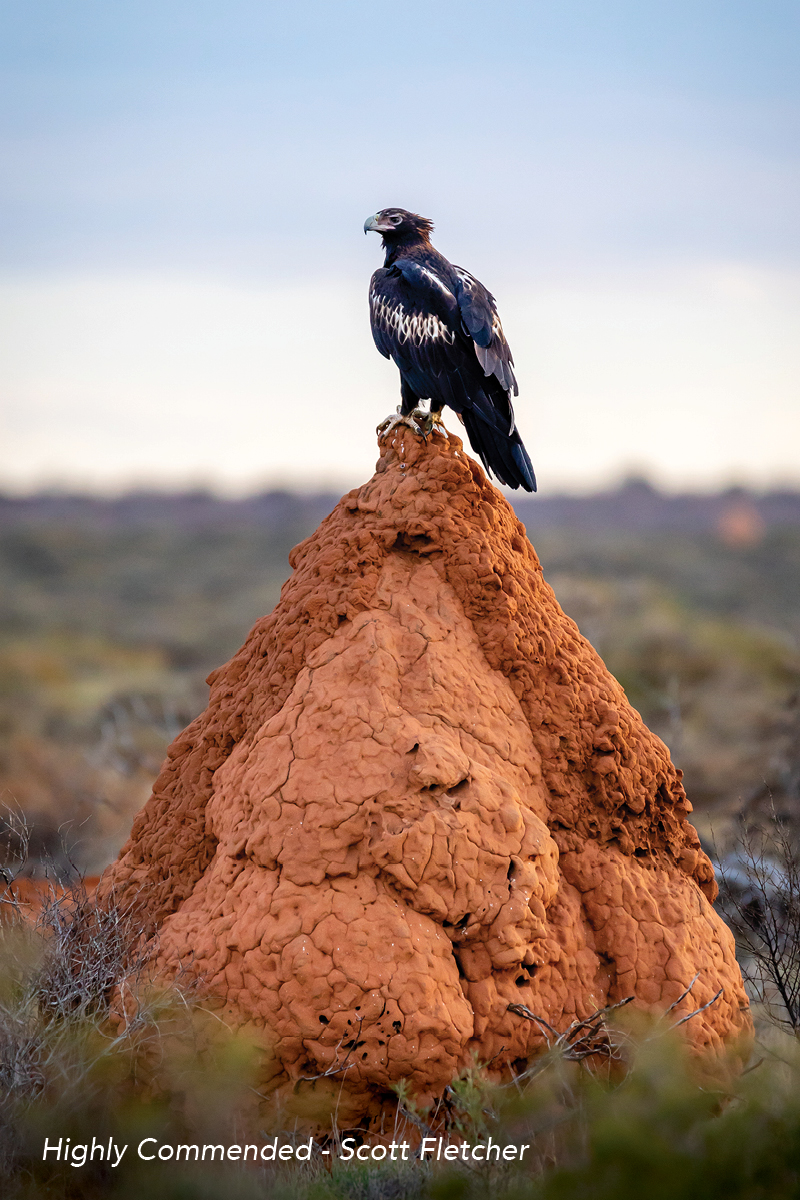 Bathed in the soft glow of early morning light, a wedge-tailed eagle perches on a termite mound, scanning the vast outback in search of prey. These majestic birds are Australia’s largest bird of prey!