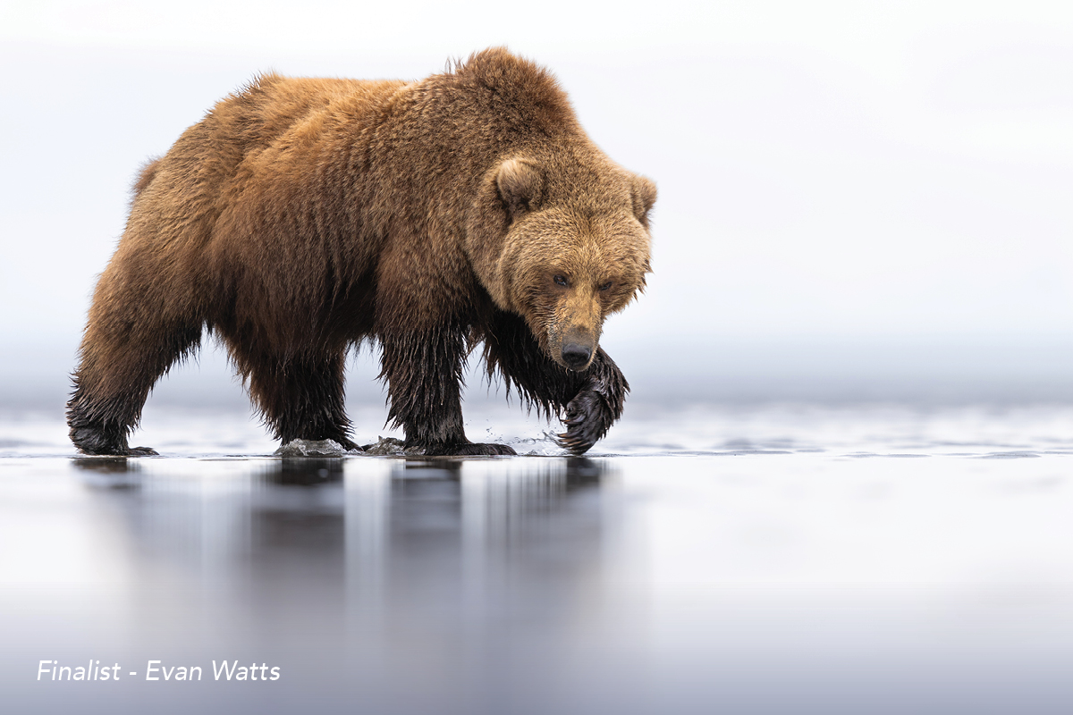 When the tides recede and the ocean floor is uncovered, coastal brown bears walk out onto the newly-revealed mudflats to dig up and feed upon razor clams. Here, a bear walks across a glassy pool of seawater on the hunt, the overcast skies creating a beautiful, minimalistic environment for images.