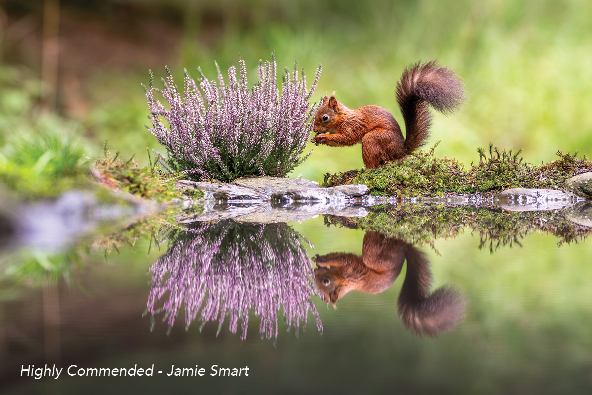 Red Squirrels are a rare sight these days in the United Kingdom. I was so lucky to get to find and photograph some in spring this year. This one is enjoying a nut cache at the edge of the water next to some beautiful pink heather.
