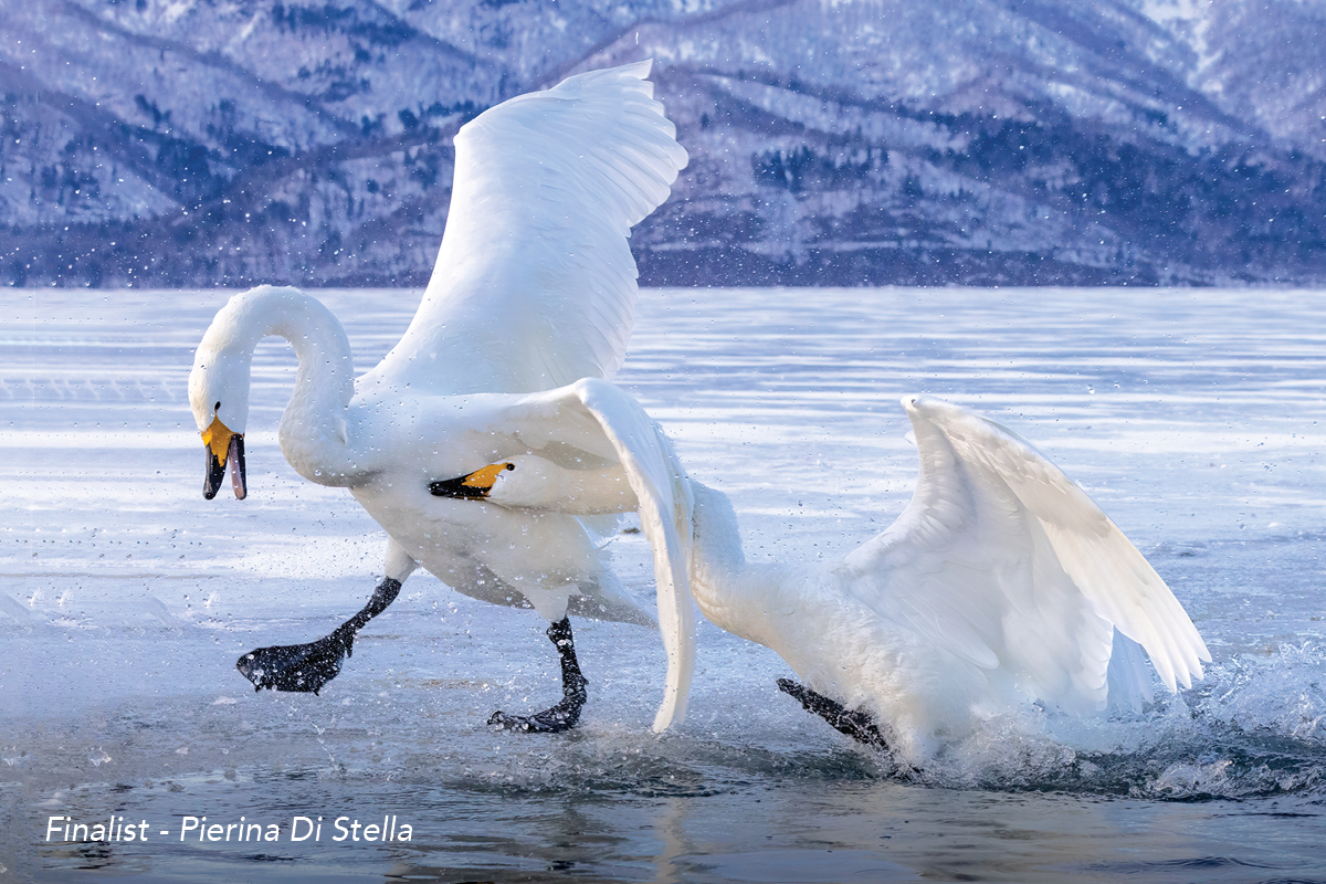 Each winter, hundreds of whooper swans gather along the shores of Lake Kussharo in Hokkaido. Watching these majestic birds interact against the backdrop of a stunning icy landscape is truly a delight. This photo is one of several capturing the lively behavior of this pair in action.