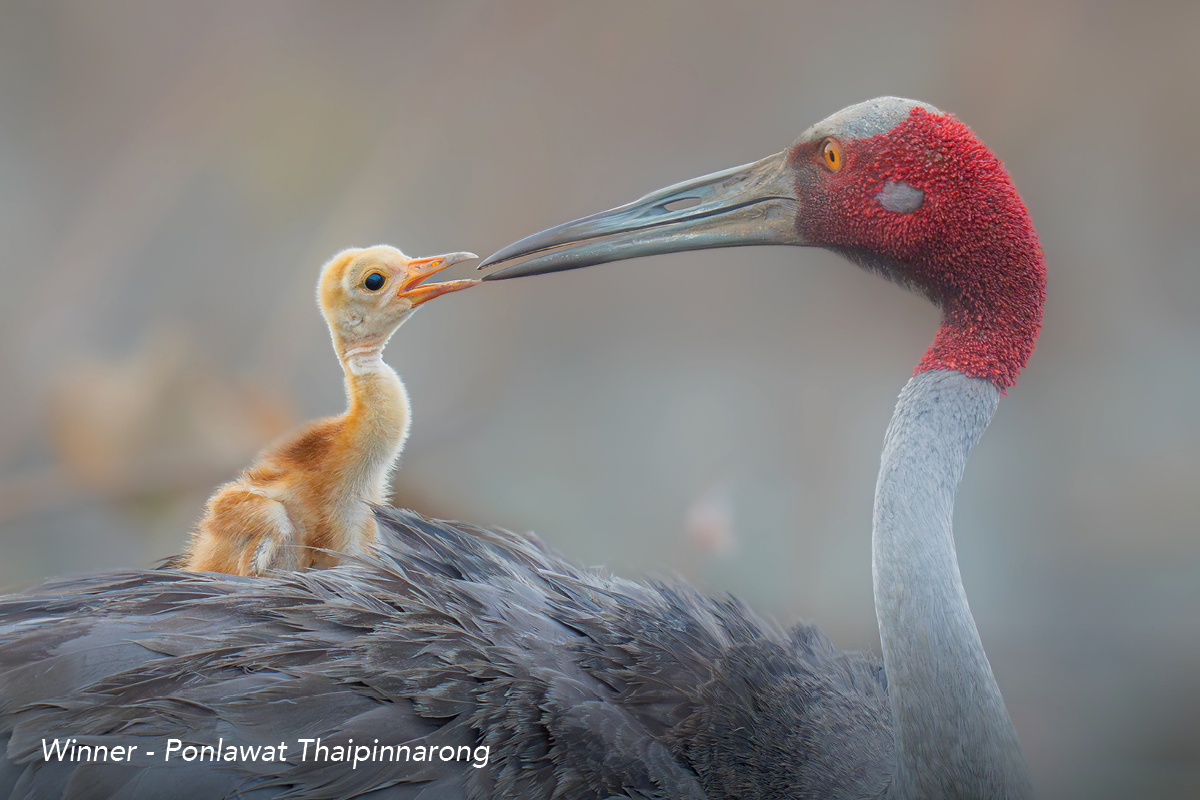 In the breeding season, sarus cranes made a nest in some rice paddies. I would lie down for several hours a day a comfortable distance away, so they got used to my presence and allowed me to capture this photo illustrating the intimate relationship between the parents and chicks.