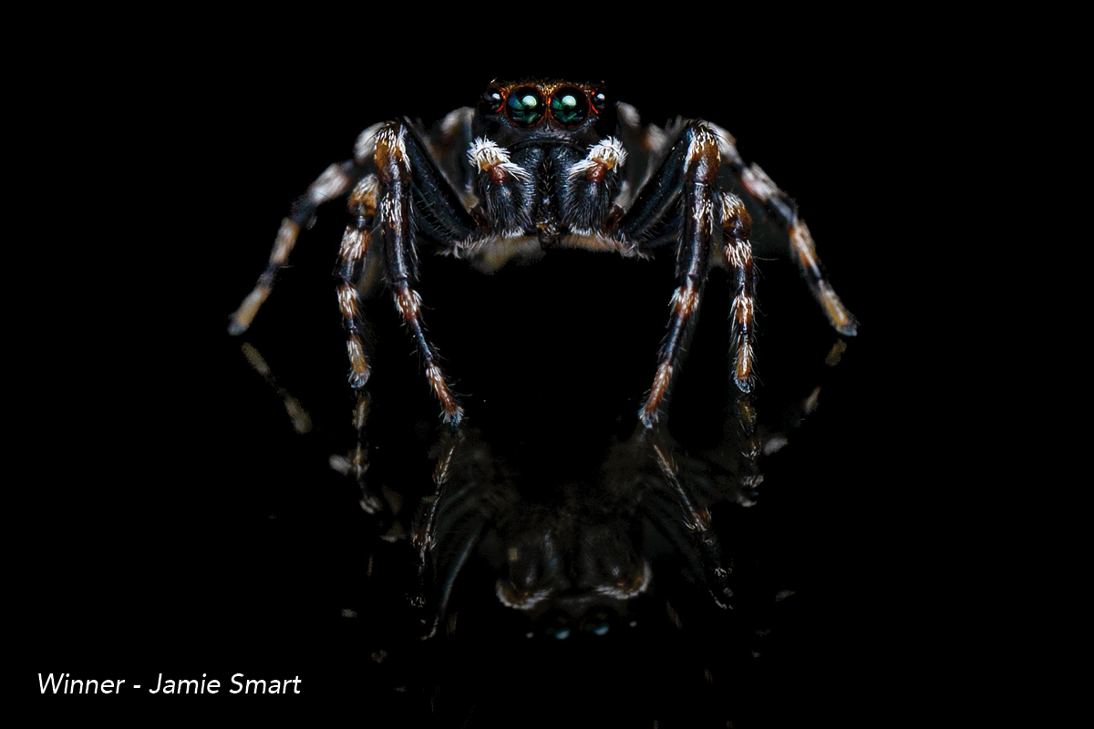 I noticed this little jumping spider on the kitchen window one night and loved the reflection it was creating. Getting up onto the work surface, I contorted myself into all sorts of angles to get this photo using a flash and Cygnustech diffuser. I love spiders!