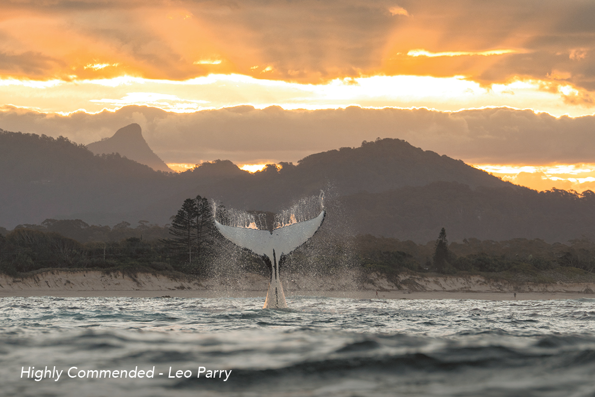 I captured this photograph with my dad off the coast of Byron Bay, the sun was setting and then all of a sudden a humpback whale started to slap its tail in front of Woolumbin and the iconic hinterland of the Border Ranges.