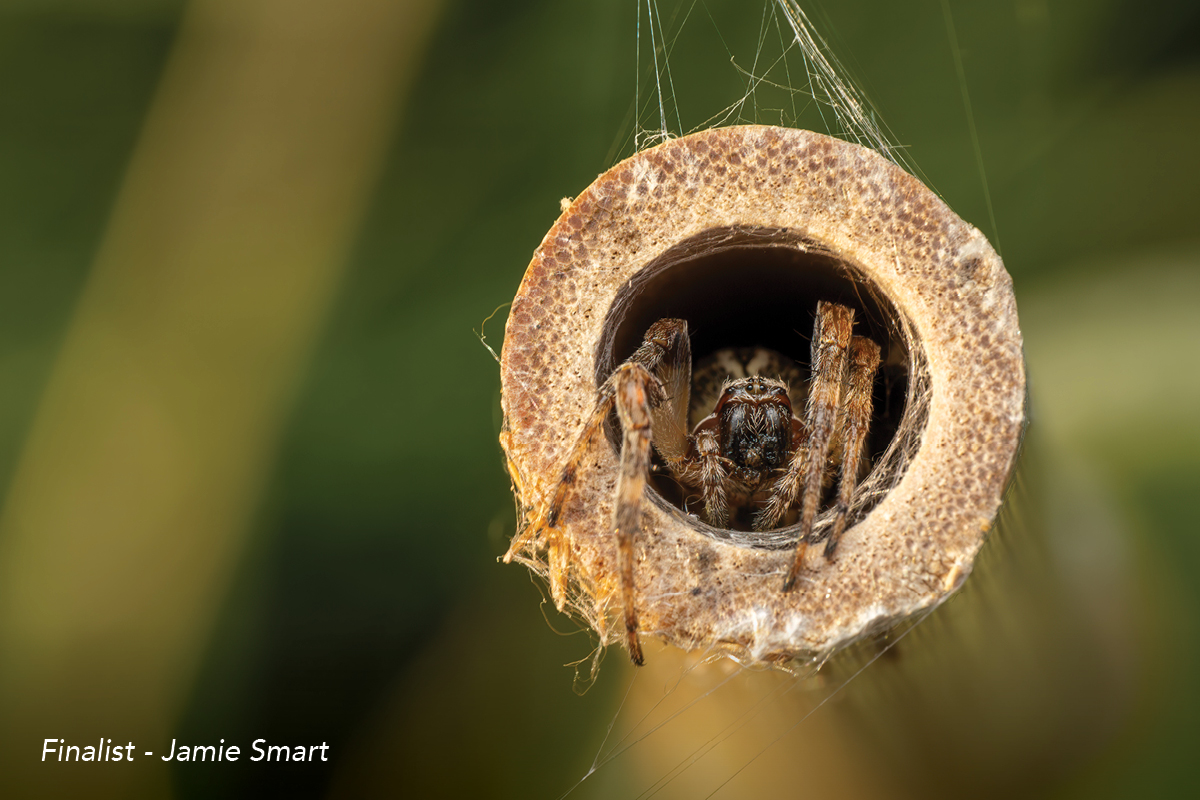 I spotted this little spider hiding in the end of a bamboo stick and spent some time watching it run in and out of its home every time an unsuspecting insect got caught in its web! I took this photo looking straight down into the bamboo cavity to create this suspended effect.